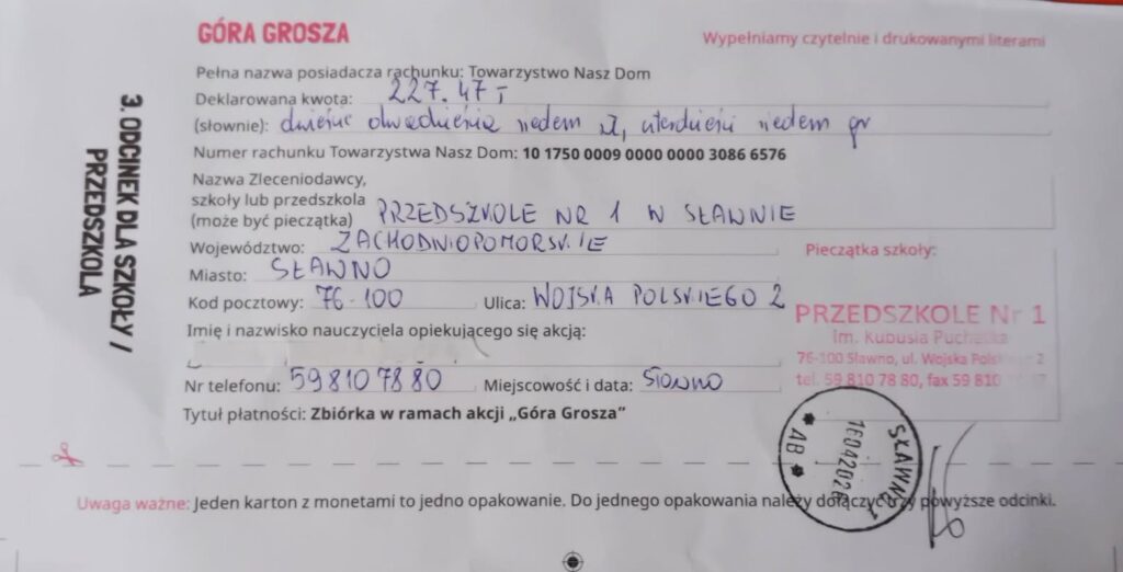 Z ogromną radością informujemy, że nasze przedszkole zakończyło udział w XXVI edycji ogólnopolskiej akcji „Góra Grosza”, organizowanej przez Towarzystwo Nasz Dom. Celem akcji była zbiórka funduszy na pomoc dzieciom wychowującym się poza własną rodziną. Zebrane środki zostaną przeznaczone m.in. na pomoc psychologiczną, wsparcie rzeczowe oraz specjalistyczną opiekę. Dzięki zaangażowaniu dzieci, rodziców oraz nauczycieli udało się zebrać łącznie 227,47 zł. W poszczególnych grupach zebrano: